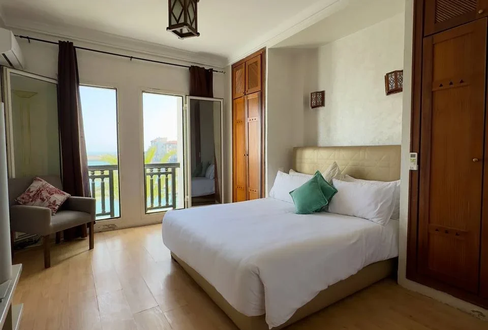 L’appartement comprend une chambre spacieuse équipée d’un lit double confortable. La décoration y est simple, élégante et pensée pour favoriser le repos. La vue sur la Marina renforce le sentiment de sérénité et donne l’impression de séjourner dans un véritable cocon avec un panorama unique sur Agadir.